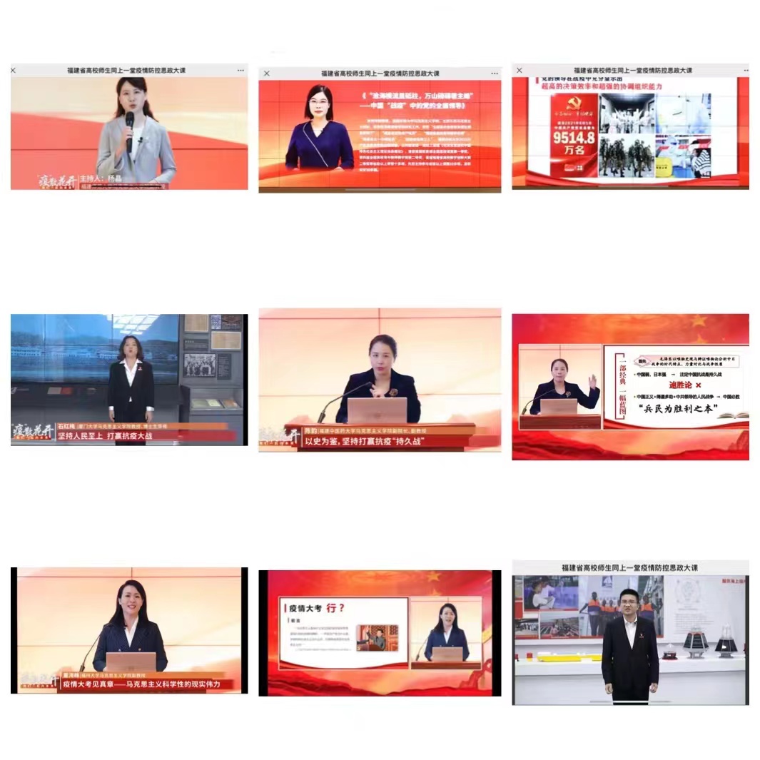 为深入学习贯彻习近平总书记关于疫情防控工作的重要指示精神,将思想政治理论课教学优势转化为支持疫情防控工作的强大力量,4月9日上午中共福建省委教育工委组织开展全省高校师生“同上一堂疫情防控思政大课”在线直播活动。学校高度重视本次活动,各级党、团组织,各个班级及马克思主义学院分别将活动纳入“三会一课”、“三会两制一课”、主题班会和集体备课会之中。全校5个党总支、4个团总支、125个行政班级,6000多名师生参加了此次活动。