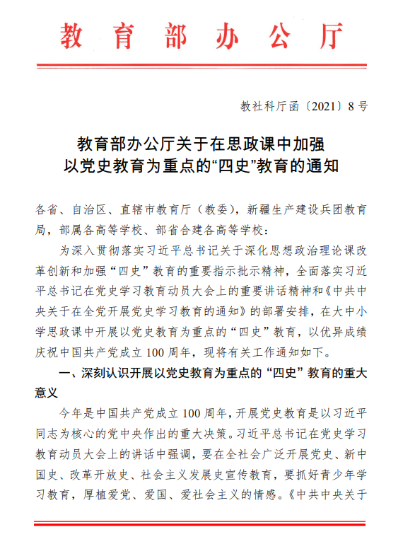 教育部办公厅关于在思政课中加强以党史教育为重点的“四史”教育的通知